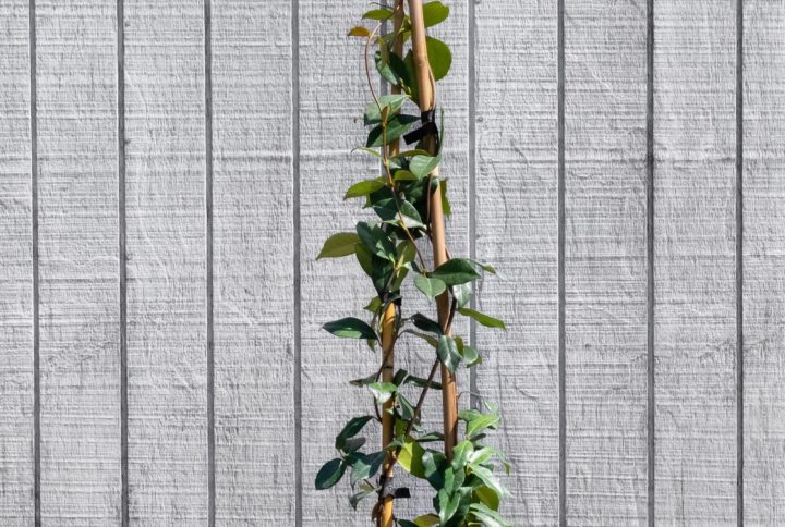 Trachelospermum jasminoides Chinese Star Jasmine. Hardy. Ultimately 9 x 9m. Woody stemmed, evergreen twining climber, with dark green foliage colouring to a fiery bronze-red in winter. From mid summer masses of pure white fragrant flowers are produced.