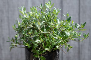 Westringia fruticosa ‘Grey Box’ Coastal Rosemary. A hardy, evergreen shrub with grey-green foliage and produces pale lilac flowers from spring and into summer. Tolerates coastal conditions, frost and periods of drought. Plant in full sun where soil is free-draining. May be grown in beds, borders, containers and is also suitable low hedging and screens. Responds well to trimming and pruning. Grows to between 40cm and 60cm in both height and width.